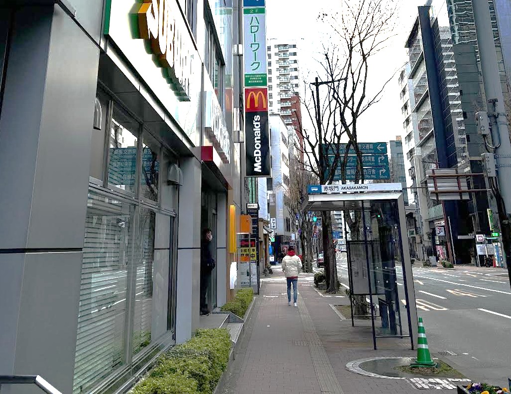 ※当ビルは赤坂交差点に面した銀色のビルで、当ビル1階には、スターバックスコーヒー様、ドラッグイレブン様、サブウェイ様、マクドナルド様が入居されています。ドラッグイレブン様とサブウェイ様の間にある正面玄関を入り、正面のエレベーターで2階へお上がりください。